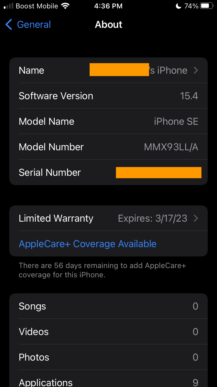 아이폰 정보입니다. iOS는 15.4 버전으로 세팅되어 있었고요, Model Name이 그냥 iPhone SE 로 되어 있네요.. 모델 넘버로만 구분이 가능할 거 같습니다.