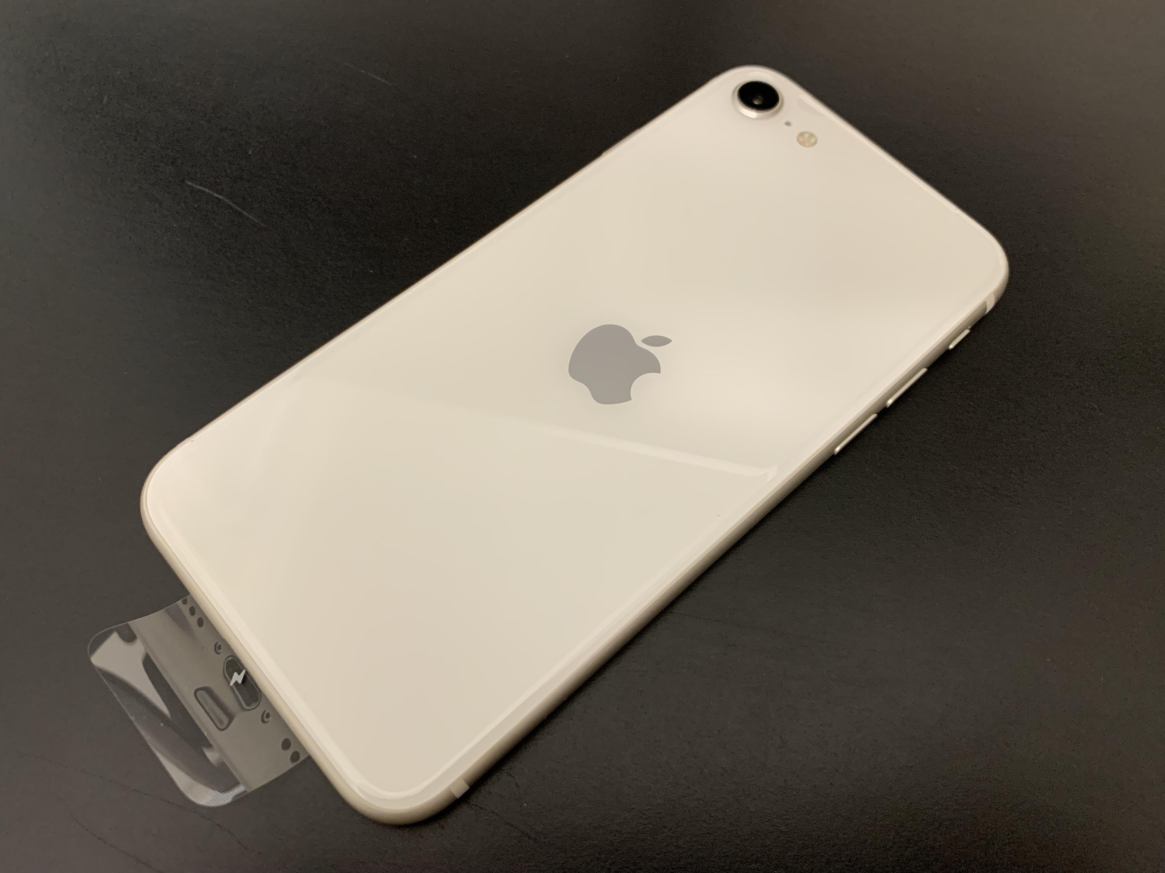 제품의 뒷면입니다. (필름 떼기 전입니다.) iPhone SE는 앞면 베젤은 모두 검정색이고 뒷면만 색상이 다른 것 같습니다.
